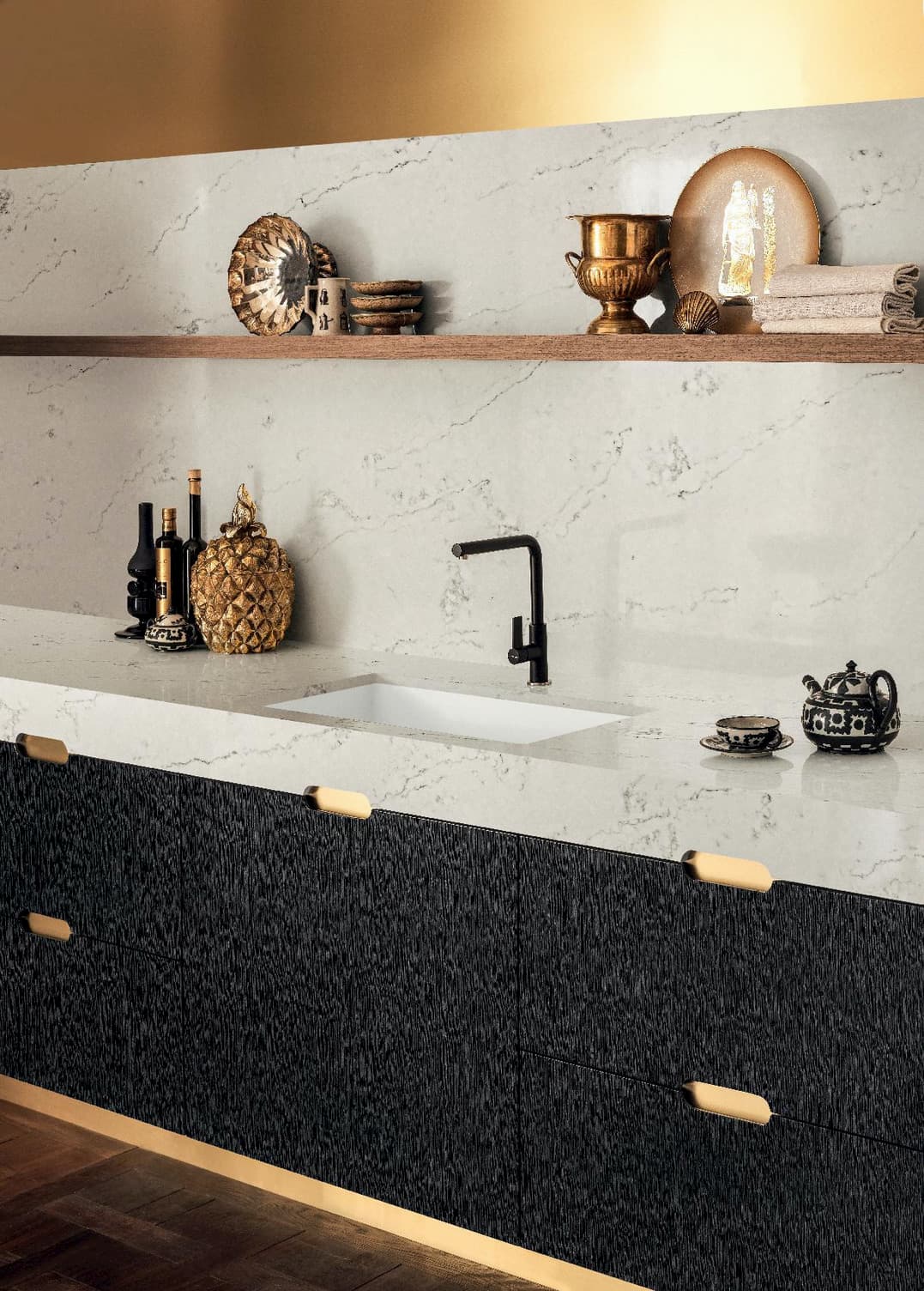 El destellante cristal dentro de las superficies de cuarzo Corian® Quartz, equilibra el espléndido juego de luz con la fascinante profundidad.